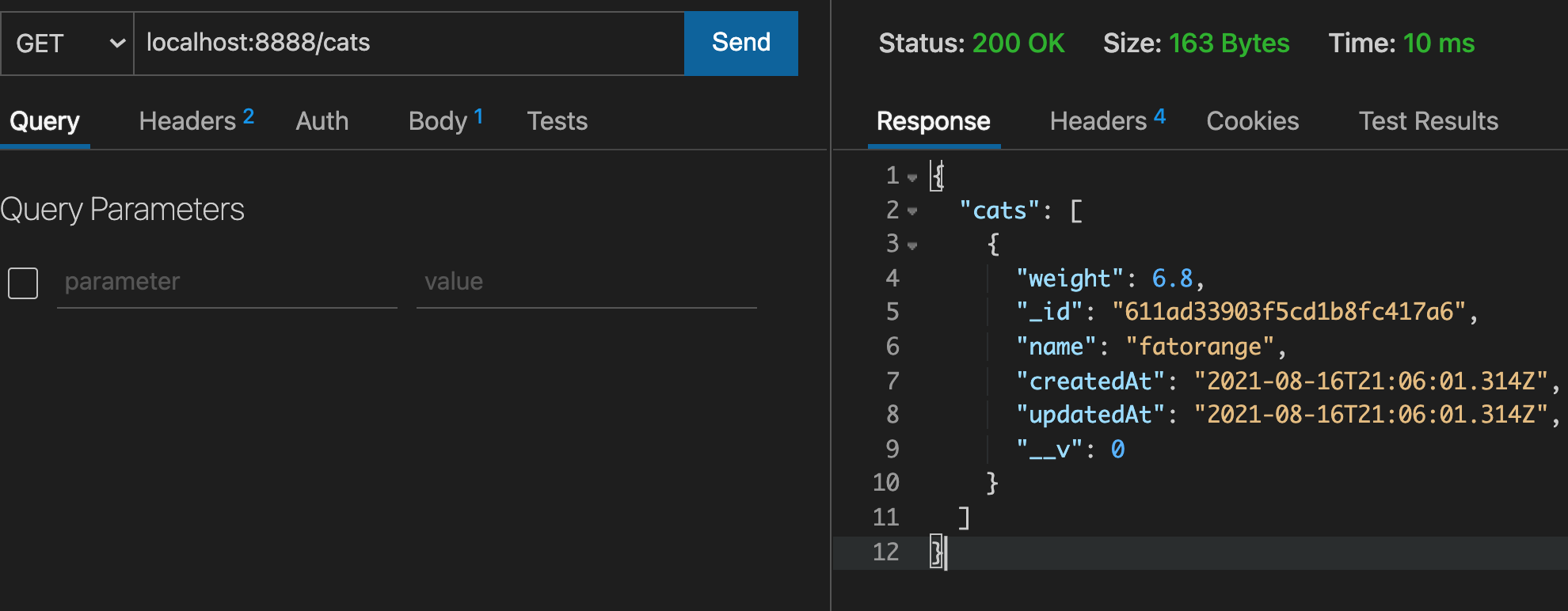 const response = await server.inject({ method: 'GET', url: '/api/cats' })